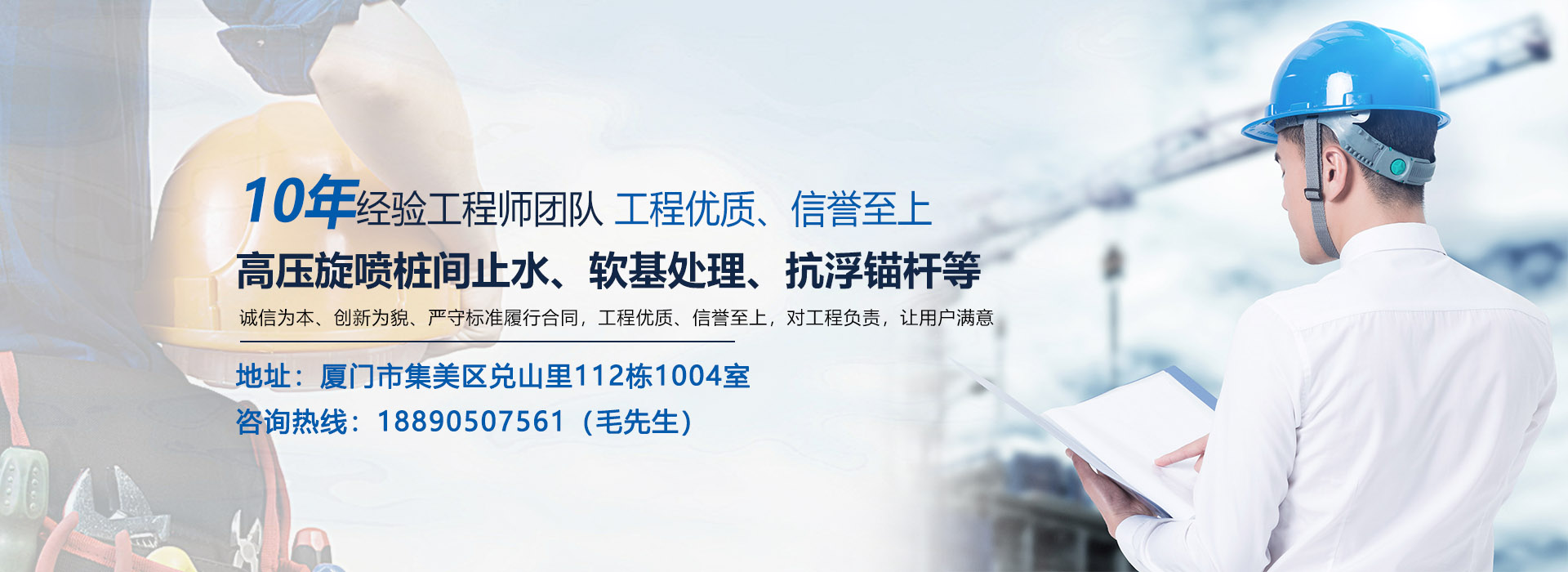 公司主營:高壓旋噴樁間止水、軟基處理、抗浮錨桿、回收錨索、地質(zhì)勘察、地基加固、降水井、攪拌樁、壓密注漿、引孔注漿、雙液注漿等,公司規(guī)模龐大,不斷超越、追求完美,誠信為本、創(chuàng)新為貌、嚴(yán)守標(biāo)準(zhǔn)履行合同,工程優(yōu)質(zhì)、信譽至上,對工程負(fù)責(zé),讓用戶滿意。